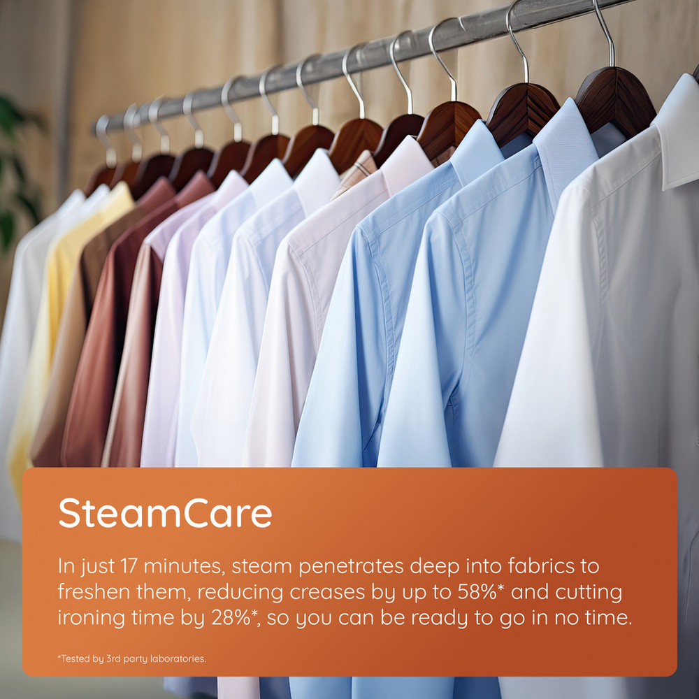 - SteamCare refresh – Got lightly worn clothes? Steam refreshes garments in just 17 minutes, reducing creases and cutting down ironing time.
