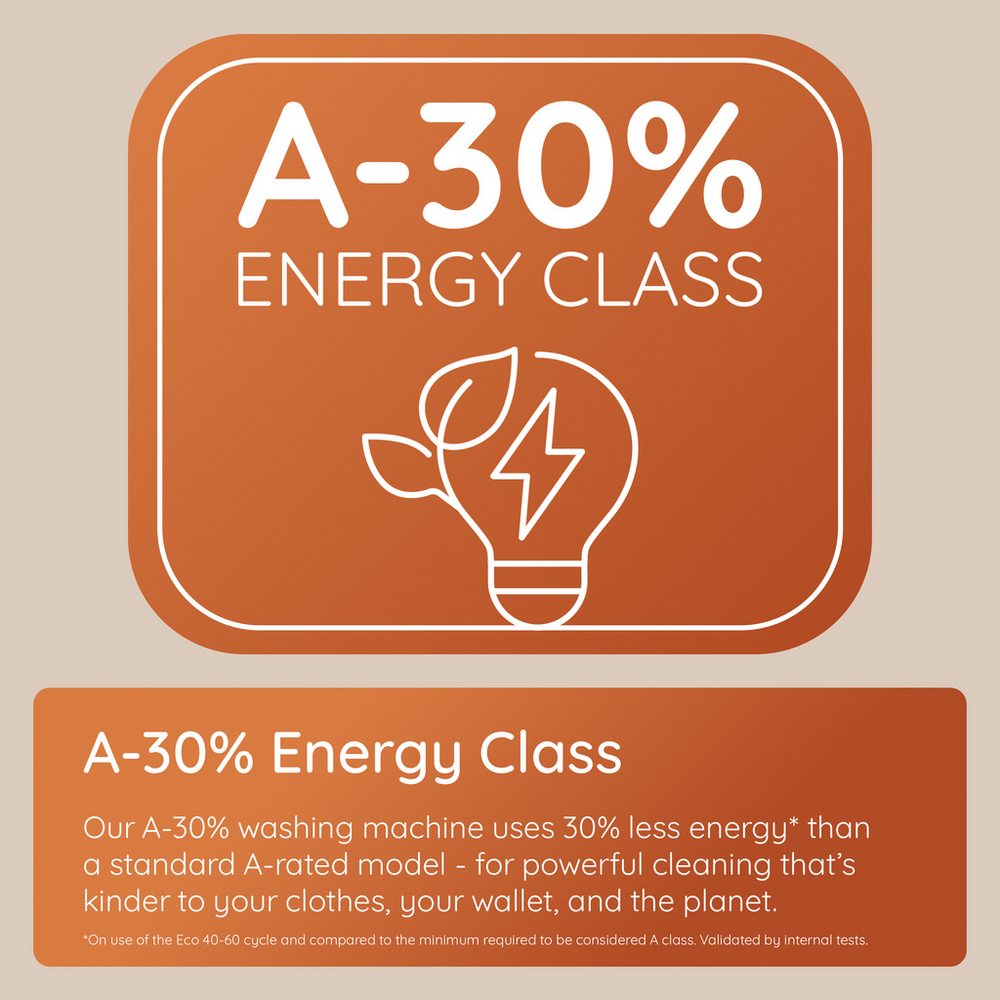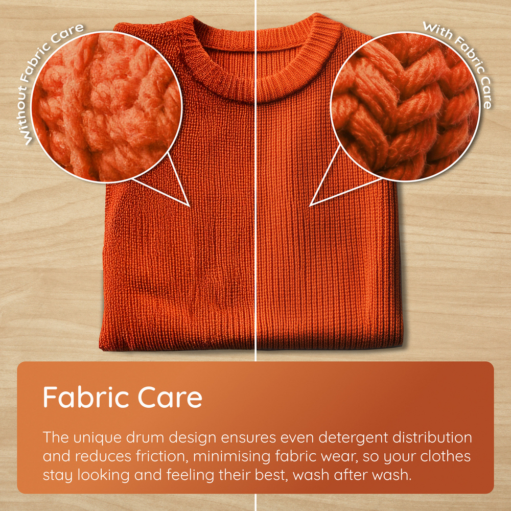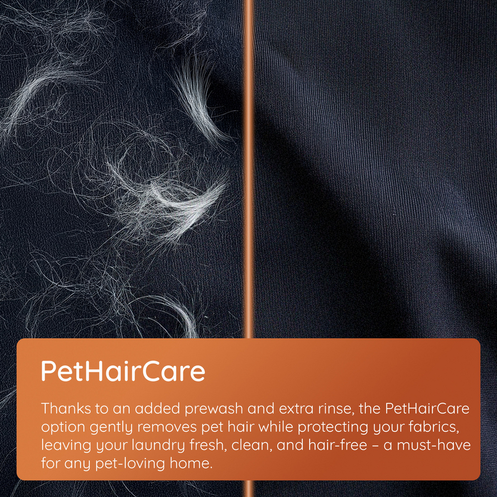 What makes this 9kg washing machine stand out is how thoughtfully it cares for both your clothes and your time. Equipped with Fabric Care technology, it delivers a gentle, low-friction wash to help your favourite garments last longer. Colours stay vibrant thanks to ColourCare, which protects fabrics even at lower temperatures. And for pet owners, the PetHairCare cycle is a game-changer, removing stubborn hairs with a prewash and extra rinse — say goodbye to lingering fur on your favourite sweaters!