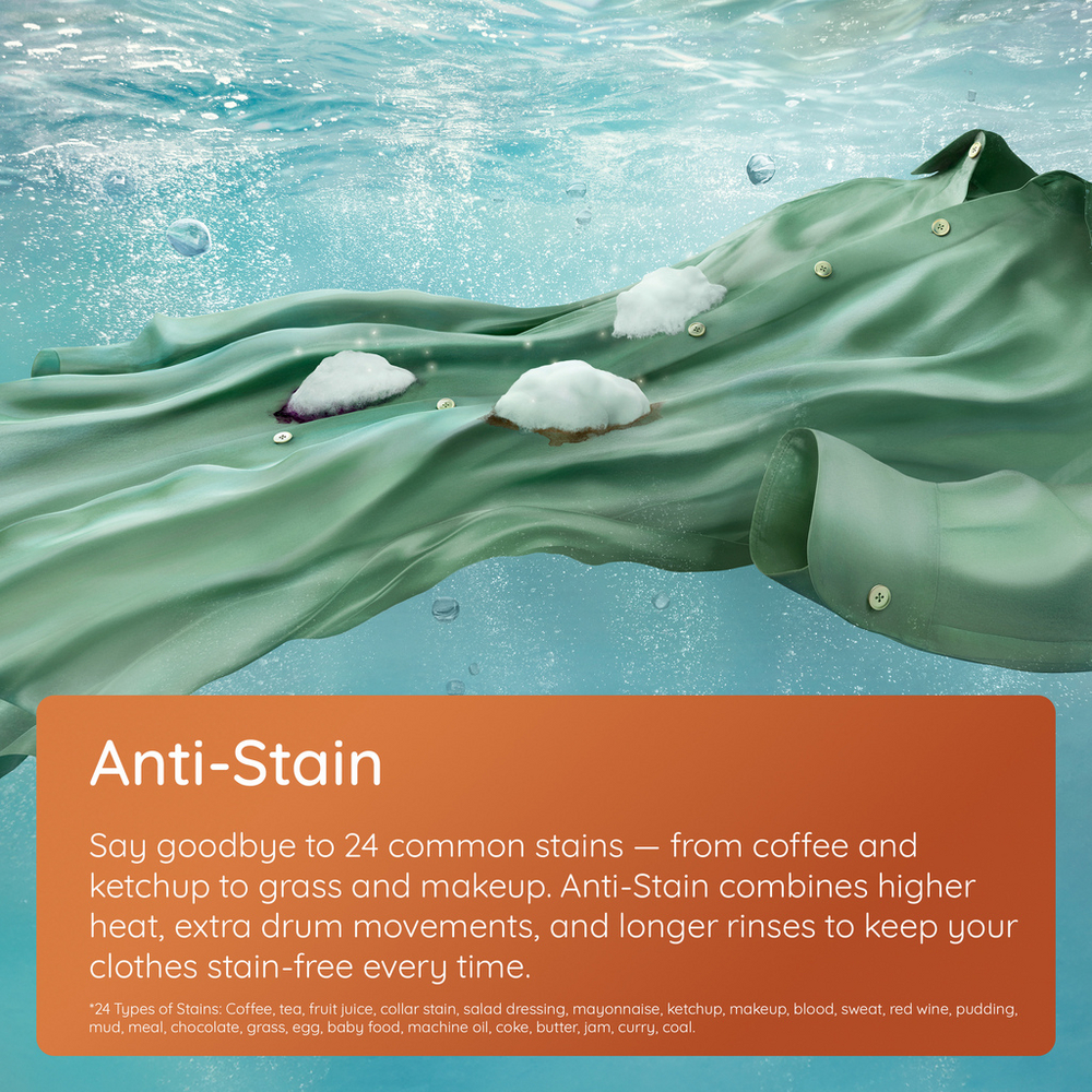 - Anti-Stain programme – Tackles 24 common stains, from grass and ketchup to makeup and coffee, so you don’t need separate stain treatments.